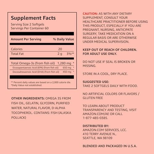 EPA and DHA Omega-3 fatty acids contribue to the normal function of the heart. DHA plays important roles in the functioning of the brain and the eye. Amazon Elements thoroughly tests every batch of product for quality and safety–see below for detailed information about ingredient origins. Suggested use: Take 2 softgels daily with food. CONTAINS: FISH (ALASKA POLLACK).
