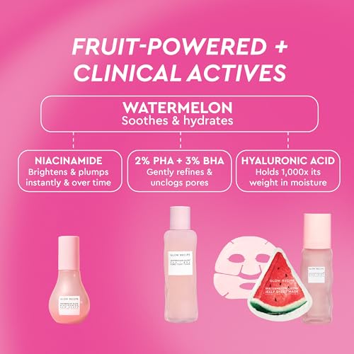 Glow Recipe Watermelon Glow Dewy Skin Routine Kit – Full Size Dew Drops Serum, Full Size Pink Juice Moisturizer, Travel Size PHA+BHA Pore-Tight Toner & Watermelon Jelly Sheet Mask (4 Count)
