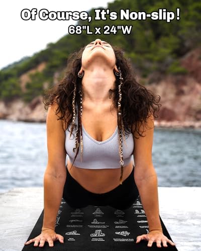 Enhance your yoga practice with this instructional yoga mat featuring 75 illustrated poses and 75 stretching exercises, perfect for beginners. The 1/4” thick, non-toxic, and non-slip surface ensures safety and comfort during workouts at home or outdoors. Ideal as an exercise mat for home workout or fitness routines