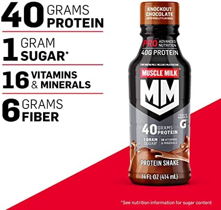 KEY FEATURES – Based on 1 shake, Muscle Milk Pro Advanced Nutrition Protein Shakes contain 40g protein, 1g sugar, 16 vitamins and minerals and a good source of fiber.