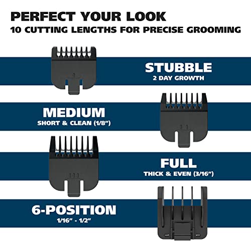 10 Cutting Lengths – Achieve a range of beard styles with 10 different beard trimming lengths from 1/8” to ½”; include stubble (1/16) , medium (1/8”) , and full guard (3/16”) in addition to a 6 position guide (1/16” to ½”)