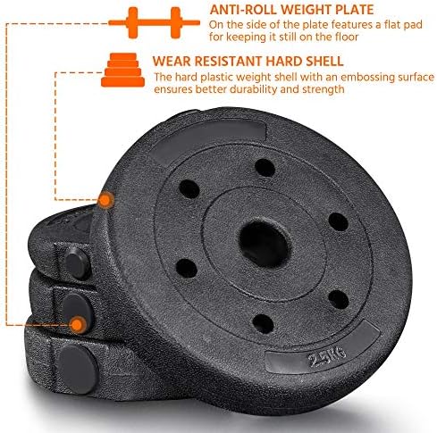 Durable Materials: This 33 lb dumbbell set is made of cement weight plates covered with durable plastic and electroplated metal dumbbell bars. The solid materials are ready for years of use